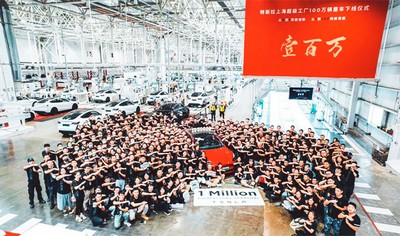 特斯拉CEO马斯克称特斯拉上海超级工厂生产出了第100万辆汽车 特斯拉汽车总销量已超300万辆。