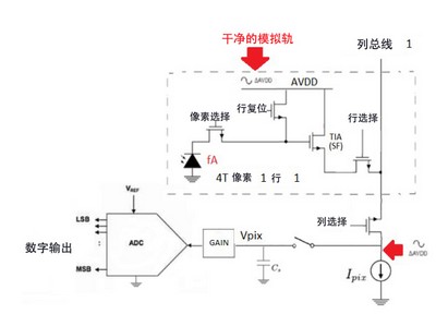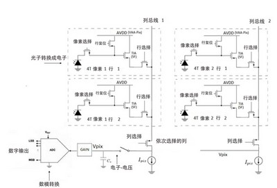任何CMOS成像系统都含一个有源像素区和光电探测器,光电探测器用于捕获光子并将其转换成非常小的光电流或电子。不同的部分读取数据,包括ADC、模拟信号处理、用户接口数字逻辑、计时等。在飞安(Femto amp)范围内的少量光电二极管电流在曝光时间(打开快门)内被整合成少量的电荷,由ADC转换成可读的的电压。