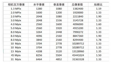 图2. 常见相机像素列表