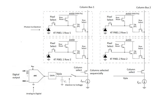 现有多种不同的像素晶体管设计,包括三晶体管 (3T)、四晶体管 (4T) 和五晶体管 (5T) 版本。在 4T 布局中,光电二极管将接收到的可见光子转换为电荷。每个电压一次读取一行并放入柱状电容器 (C) 中。然后使用解码器和多路复用器进行读取。