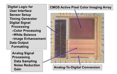 典型的 CMOS 成像系统包含有源像素颜色阵列、模拟信号处理电路、模数转换器和用于控制接口、时序和数据读取的数字部分。阵列的填充因数是感光部分相对于传感器总尺寸的百分比。光电探测器是一种光敏传感器,用于捕获可见光子并将其转换为电流(毫微微安级)。分辨率用于量化 CMOS 图像传感器中的总像素阵列数,例如,200 万像素传感器阵列是 1600 列和 1200 行。但是,阵列中的像素并非都是有源的(可用于光检测),其中有些(在光学上是黑色的)像素用于黑电平和噪声校正。