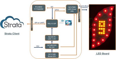 STR-NCV7685-REAR-GEVK是一款Strata赋能的汽车尾灯应用评估板,可通过蓝牙低功耗(BLE) 进行远程通信,采用线性 LED 电流驱动器 NCV7685 和业界最低功耗的蓝牙® 5 系统单芯片(SoC) RSL10 SiP ,安装了 6 颗 NCV7685 芯片来驱动总共 72 个 LED 节点,以实现具有可配置参数和自定义模式的预定义动画——所有设置和电路监控均可通过 Strata 访问。