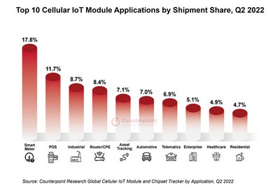 2022 年第二季度排名前五的应用——智能电表、POS 、工业、路由器/CPE 和资产跟踪——占据了整个物联网模块市场的一半以上。与上一季度相比,路由器/CPE 和住宅市场出现了显着改善。由于本季度中国汽车行业表现不佳,汽车连接市场并未表现出太大的吸引力。