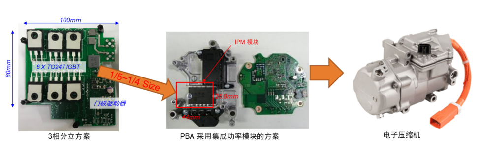 图3:电子压缩机采用安森美的ASPM比采用分立方案显著缩减尺寸
