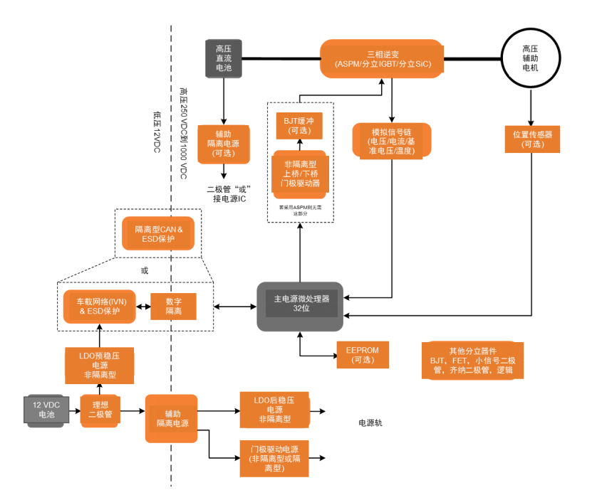 图2:汽车高压辅助系统应用框图 (橙色代表安森美可提供的产品)