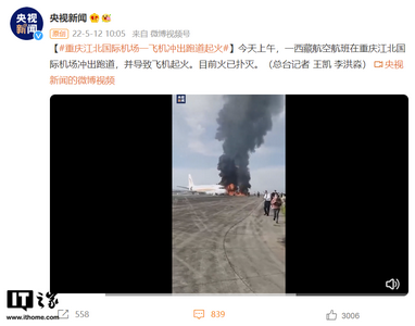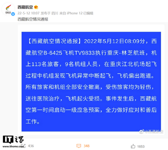 宁推网 5 月 12 日消息,今日上午,西藏航空发布情况通报称,2022 年 5 月 12 日 8:09,西藏航空 B-6425 飞机 TV9833 执行重庆-林芝航班,机上 113 名旅客,9 名机组人员,在重庆江北机场起飞过程中机组发现飞机异常中断起飞,飞机偏出跑道。