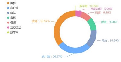在信息传播渠道上,“五一”期间“消费维权”类信息传播渠道主要有微博、客户端、网站、微信、视频、互动论坛、数字报等。其中,微博信息量最高,占比 35.67%;其次是客户端,信息量占比 26.57%;第三是网站,信息量占比 14.36%。