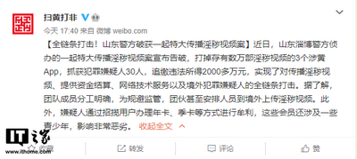 宁推网 5 月 13 日消息,据扫黄打非官方、央视新闻报道,近日,山东淄博警方侦办的一起特大传播淫秽视频案宣布告破,打掉存有数万部淫秽视频的“辣椒”等 3 个涉黄 App,抓获犯罪嫌疑人 30 人,追缴违法所得 2000 多万元,实现了对传播淫秽视频、提供资金结算、网络技术服务以及境外犯罪嫌疑人的全链条打击。