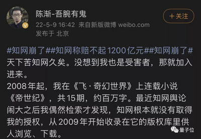 陈渐是北京知名作家,代表作品有、和等。而与知网牵扯的侵权事情,是他于 5 月 9 日在其微博中曝光:约百万字连载小说,从 2009 年开始收录在它(知网)的版权库里供人浏览、下载。