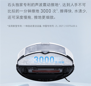 不仅如此,石头T8Plus还支持声波震动恒湿擦地,配备可升降拖板与声波震动擦地模组,最高可达3000转马达的高频震动设计,可有效瓦解地面脏污。