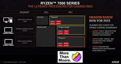 与此同时,AMD 已预告过锐龙 7000 / Zen 4 阵容,包括 Raphael 台式 AM5 处理器、Dragon Range /Phoenix 笔记本电脑 APU 。