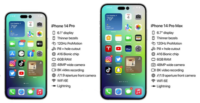 iPhone 14 Max:6.7英寸刘海屏,60Hz刷新率,A15处理器,6GB RAM,1200W主摄;