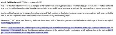 高通CFO AkashPalkhiwala近日在摩根大通JPM大会上表示,高通未来会采用多元化代工策略,如果Intel的技术路线图执行顺利,并且能够提供恰当的合作条件,高通会与其进行合作。
