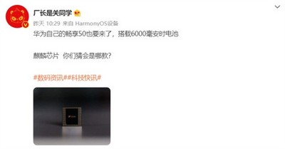 而据数码博主@厂长是关同学称,华为新款畅享 50即将发布,该机将搭载6000mAh电池以及海思麒麟芯片。
