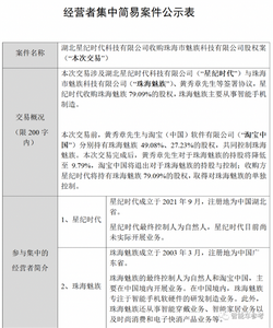 公示信息显示,湖北星纪时代科技有限公司(简称“星纪时代”)与珠海市魅族科技有限公司(简称“珠海魅族”)、黄秀章等签署协议,星纪时代拟收购珠海魅族79.09%的股权。