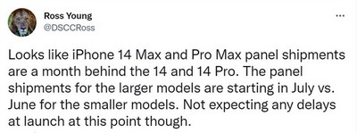 大佬Ross Young还表示,iPhone 14 Pro、iPhone 14的屏幕面板本月将正式开始出货,尺寸较大的iPhone 14Max和iPhone 14 Pro Max面板将于7月份出货。