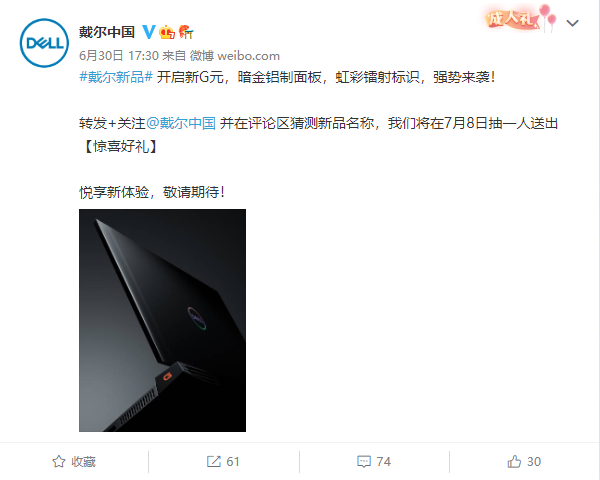 昨晚,戴尔中国官微放出了一张新品海报,文案写道“#戴尔新品#开启新G元,暗金铝制面板,虹彩镭射标识,强势来袭!”