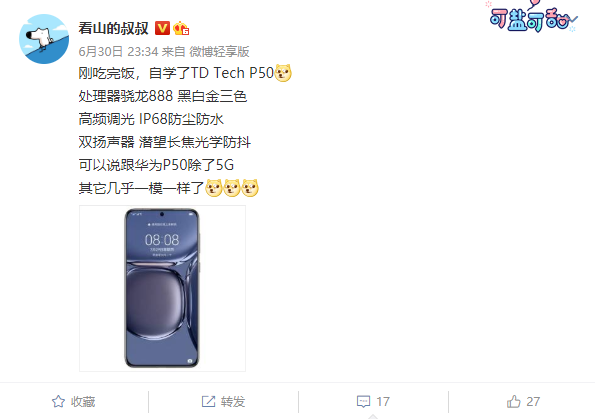 在后摄镜组排列上,TD TechP50也与华为P50颇为相似,搭载5000万像素+1300万像素+1200万像素三摄,前置居中打孔1300万像素镜头,拥有雪域白、曜金黑、可可茶金等配色。