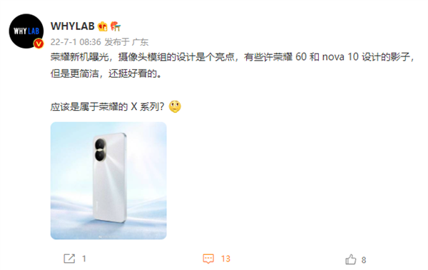 今日,数码博主@WHYLAB曝光了荣耀新机的渲染图,据称该机将属于荣耀X系列。