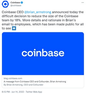 6 月14 日,Coinbase 在一封邮件中表示将大幅裁员18%。按该公司约5000 名全职员工计算,将有900 名员工失去工作。该公司创始人Brian Armstrong 表示,由于经济可能进入衰退,公司在牛市期间增长过快,在低密度市场中「降本增效」非常重要,因此Coinbase 需要缩减规模。