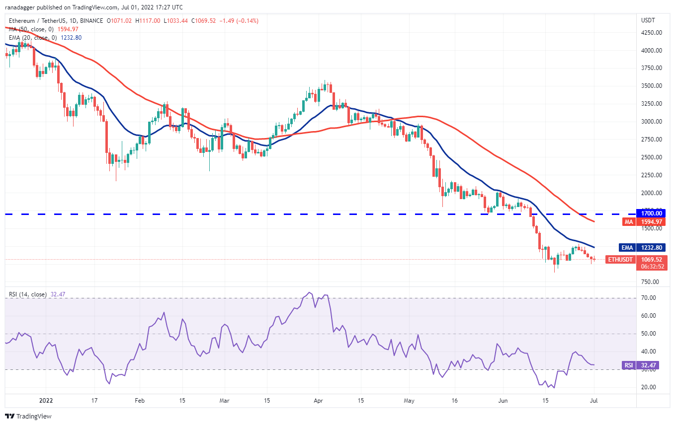 以太坊(ETH)在 6 月 30 日跌破 1,050 美元的直接支撑位,但多头买入了跌势。 买家试图在 7 月 1 日延长复苏,但烛台上的长灯芯表明空头正在小幅反弹中卖出。