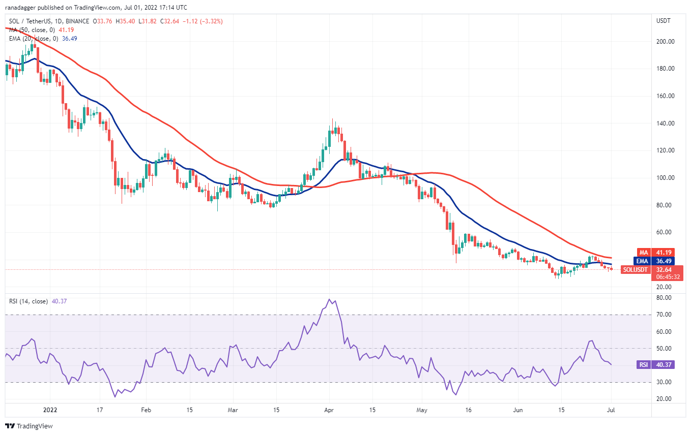 Solana (SOL) 在 6 月 30 日跌破即时支撑位 33 美元,但烛台上的长尾显示较低水平的强劲买盘。 买家试图在 7 月 1 日将价格推高至 20 天均线(36 美元)上方,但空头并未松懈。