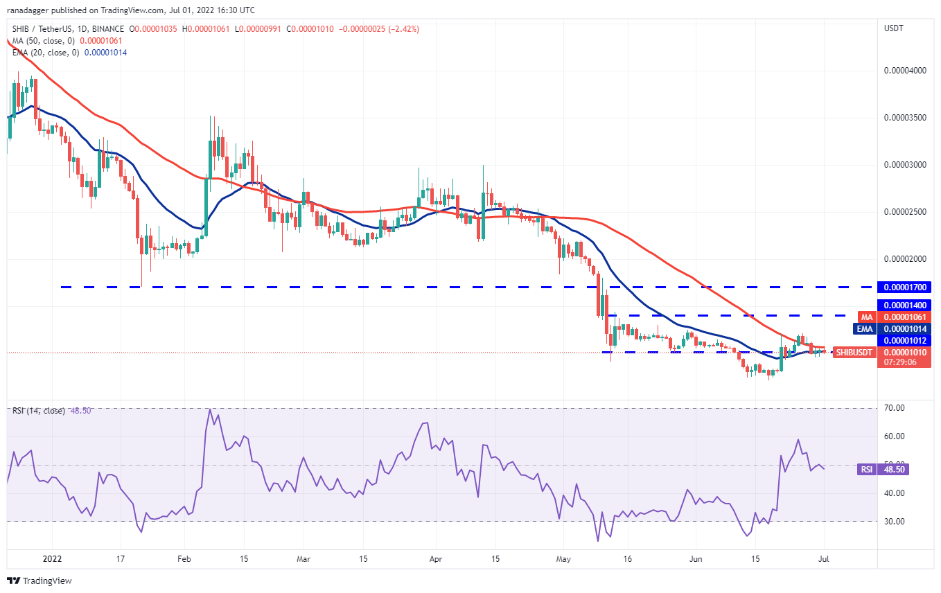 Shiba Inu (SHIB) 在 6 月 28 日收于 0.000010 美元以下,但空头可能维持较低水平。 多头逢低买入,但正努力将价格推高至 50 日均线(0.000010 美元)上方