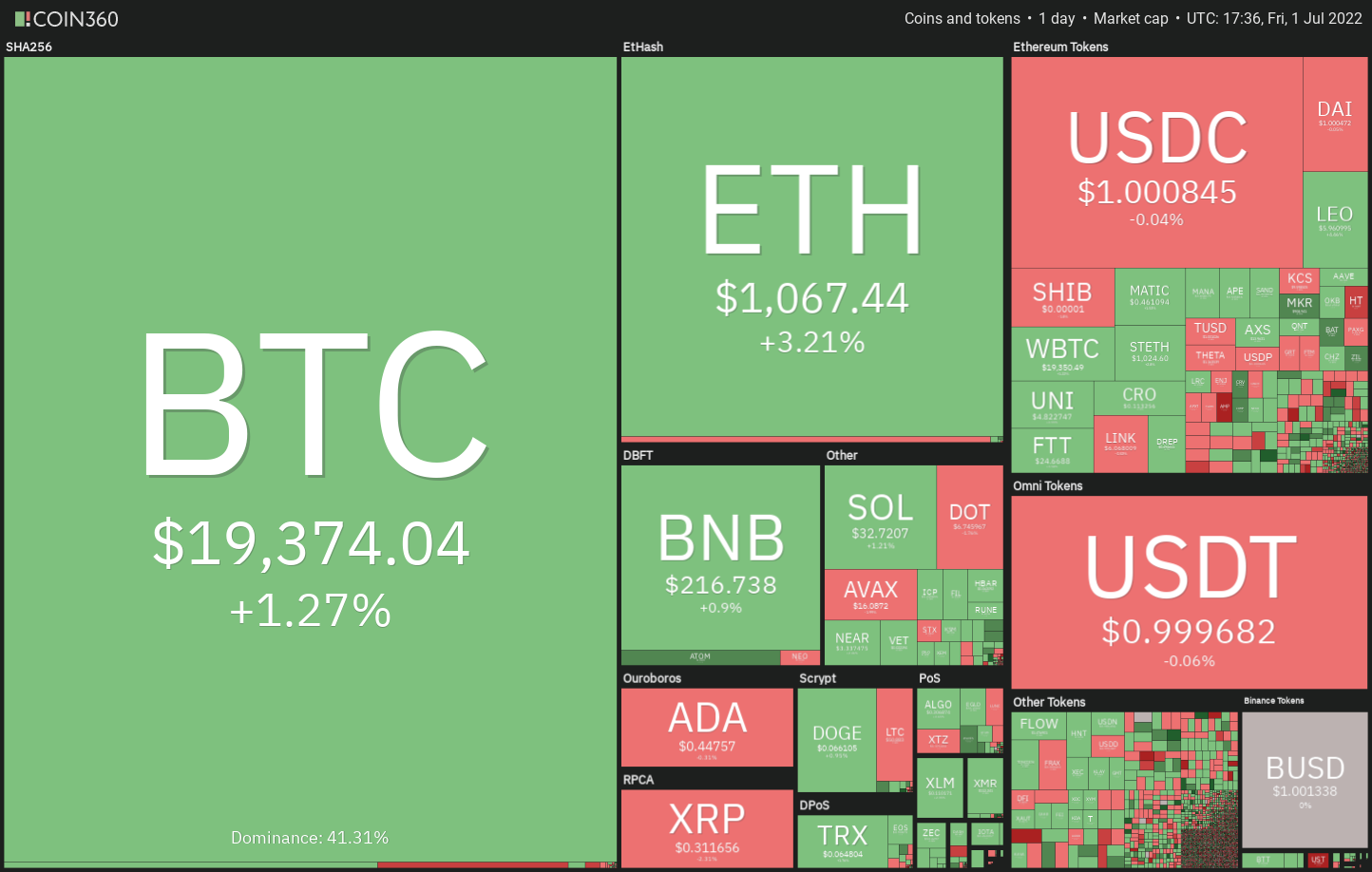 比特币在 6 月 30 日跌破直接支撑位 19,637 美元,但烛台上的长尾表明较低水平的强劲买盘。 多头试图利用 7 月 1 日的势头,将价格推向上方阻力位 22,000 美元,但烛台上的长灯芯表明空头活跃在较高水平。