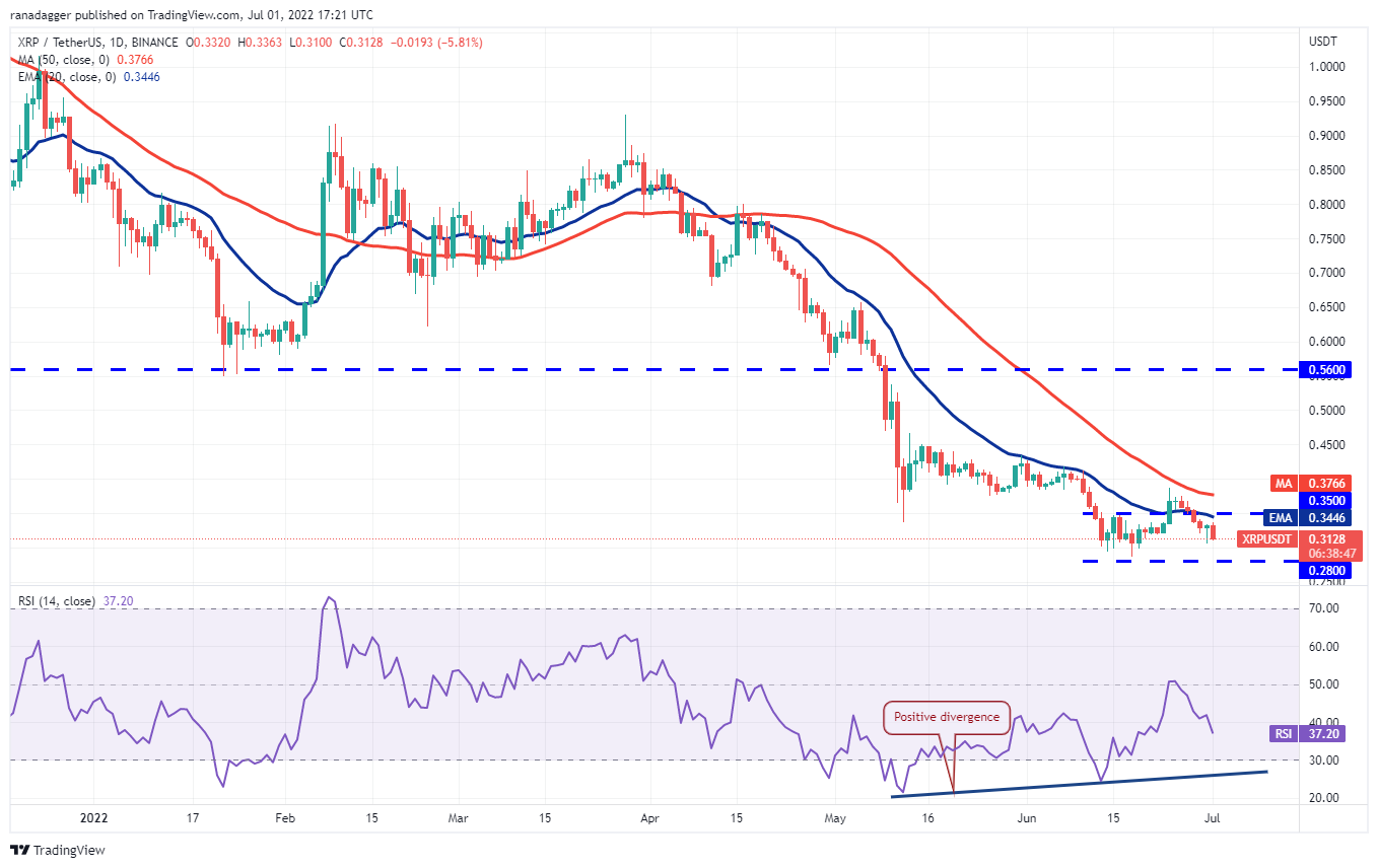 XRP/USDT 货币对可能跌至 0.28 美元的强劲支撑位,多头可能会在此进行强有力的防御。 如果价格从 0.28 美元反弹,则表明多头继续在较低水平买入。 然后,多头将再次尝试将价格推高至 50 日均线(0.37 美元)上方。