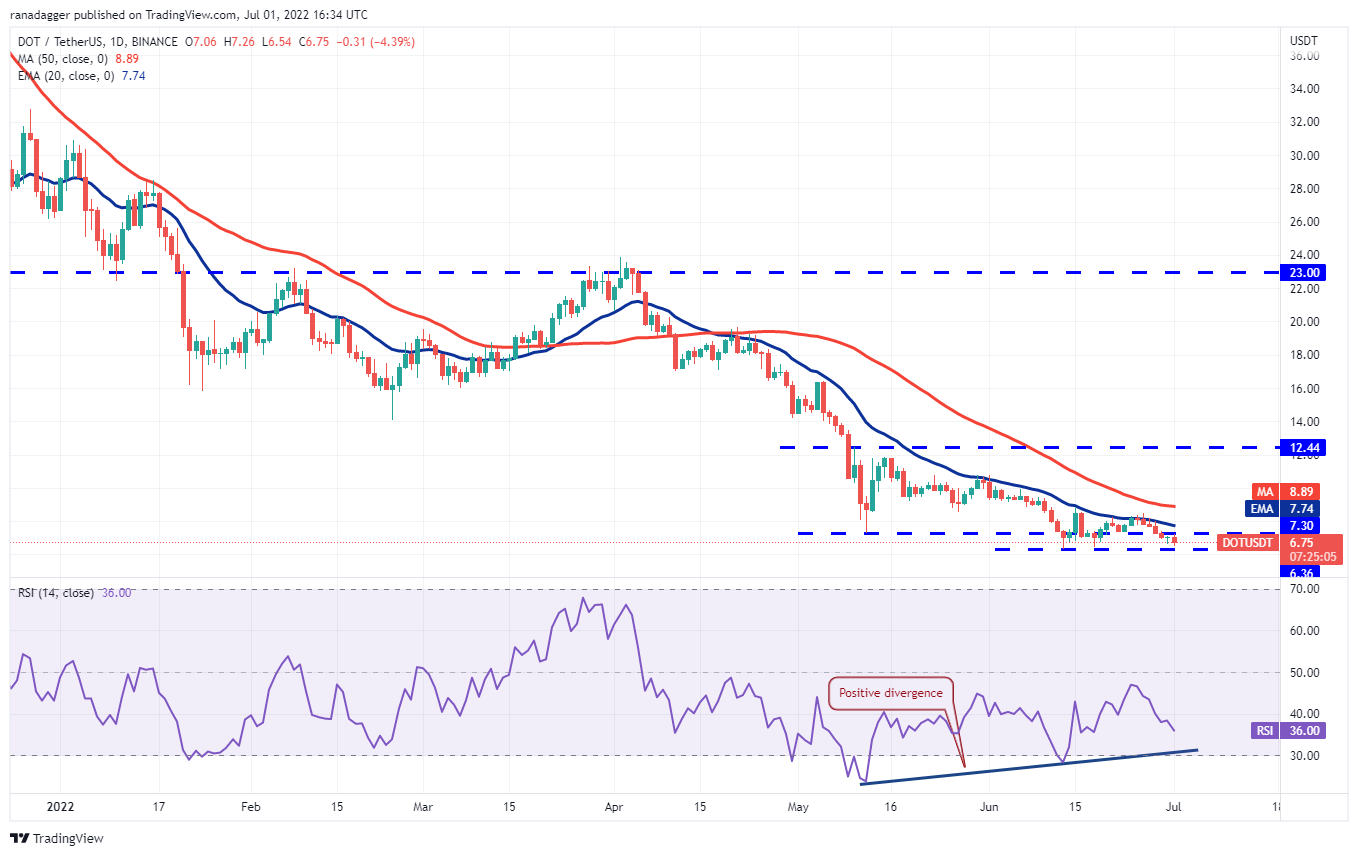 Polkadot(DOT)在 6 月 29 日跌破并收于强支撑位 7.30 美元下方。买家试图将价格推回 6 月 30 日的水平上方,但失败了。 这表明空头在每一次小幅反弹中都在抛售。