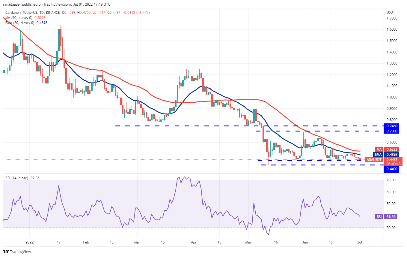 卡尔达诺(ADA)在 6 月 30 日从 0.44 美元反弹,但多头无法在 7 月 1 日清除 20 日均线(0.49 美元)。这表明空头继续有力地捍卫移动平均线。