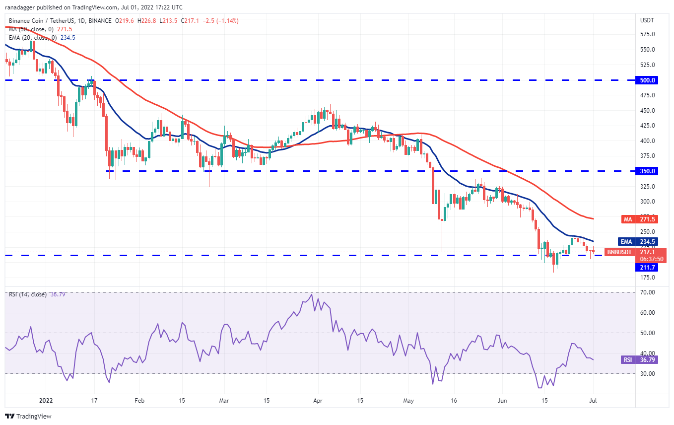 币安币 (BNB) 在 6 月 30 日跌破强劲支撑位 211 美元,但从当天烛台的长尾看,较低的水平吸引了强劲的买盘。