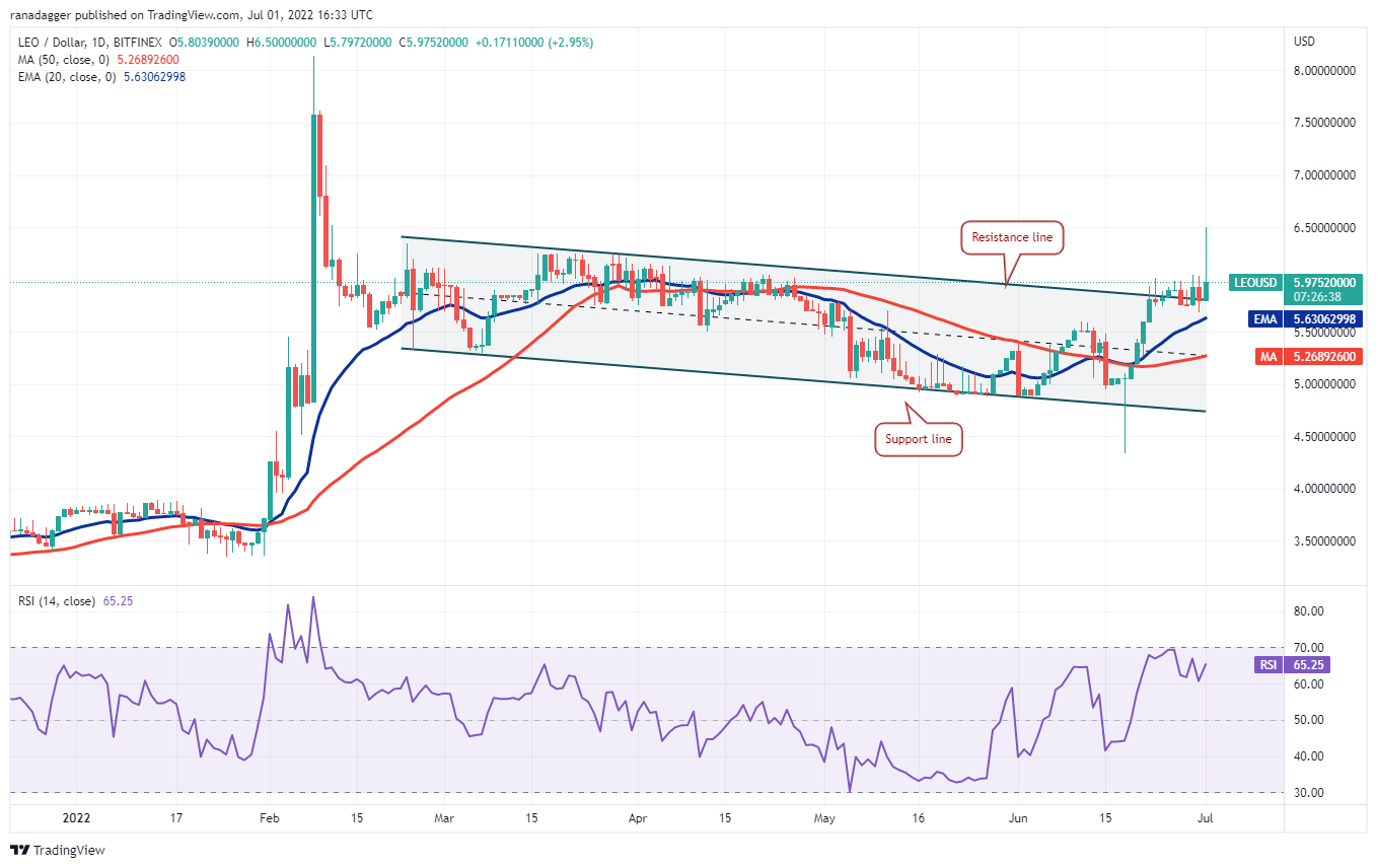 UNUS SED LEO (LEO) 在 6 月 30 日拒绝,但多头不允许价格滑回下行通道。 这表明买家正试图将阻力线转变为支撑。