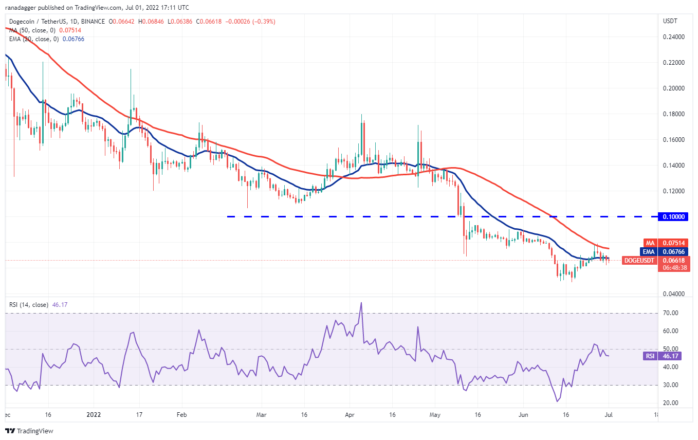 狗狗币 (DOGE) 在 20 天均线 (0.07 美元) 附近见证了多头和空头之间的一场硬仗。 RSI 略低于中点,20 天 EMA 已趋于平缓,这表明对卖家来说优势很小。