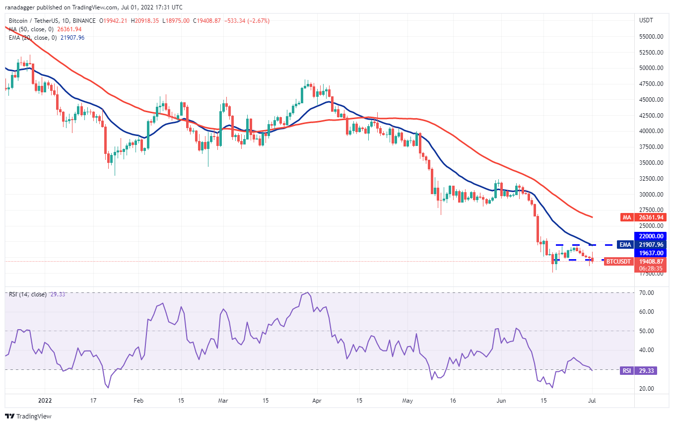 如果价格维持在 19,637 美元以下,则重新测试关键支撑位 17,622 美元的可能性会增加。 向下倾斜的移动平均线和超卖区的相对强度指数表明空头处于控制之中。