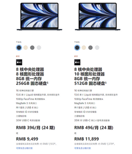 M2 MacBook Air有两种不同的处理器版本,一是8核心CPU、8核心GPU,标配8GB统一内存、256GB SSD、30WUSB-C充电器,售价9499元。