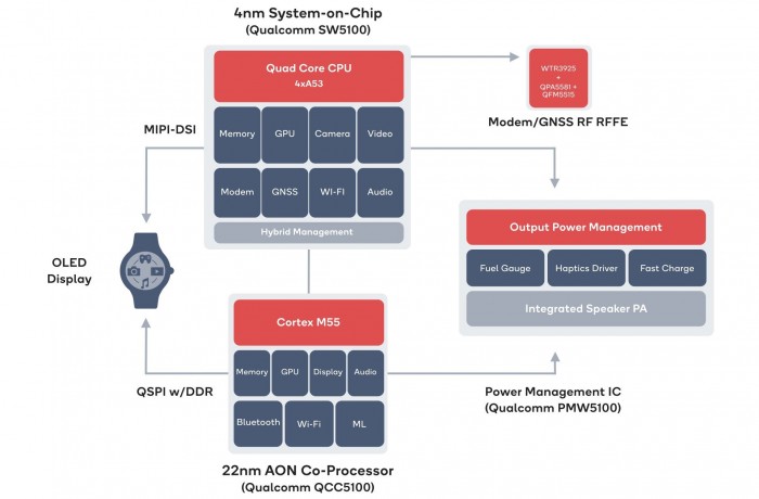 规格方面,新平台延续了 Snapdragon Wear 3100 / 4100 芯片中的混合架构 ——包括了用于交互式任务的主处理器、以及一个始终在线的协处理器来帮助节省电量。