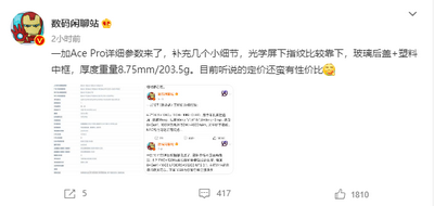 其他方面,数码博主@数码闲聊站 透露,一加Ace Pro将会采用玻璃后盖+塑料中框设计,该机光学屏下指纹位置比较靠下,而且十分有性价比,等一个香香价。
