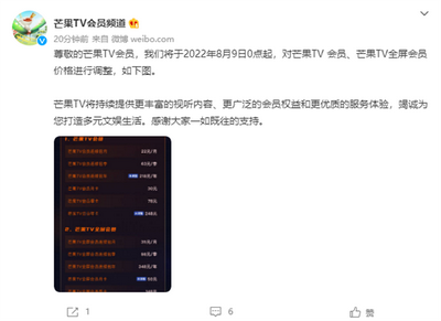 但就在宣布涨价过去半年多之后的今天,芒果TV官方账号就发布公告,宣布其会员服务将在8月9日再次迎来一波提价,最高涨幅超过了20%。