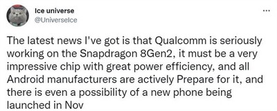 今天,博主i冰宇宙在社交平台透露,高通骁龙8Gen2是一款令人印象深刻的芯片,它拥有极高的能效比,相关终端最快11月份发布。
