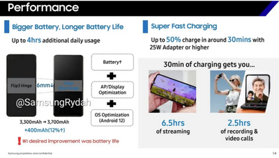 推文中的图片表明,由于电池容量的增加,Galaxy Z Flip 4 现在每天可以提供最多 4 个小时的额外使用时间。当然,这 4小时的运行时间会根据您的里程而有所不同,但这里还有另一个优势。