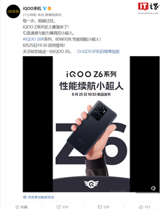 8 月 22 日消息,据 iQOO 官方宣布,iQOO Z 系列史上最强来了,iQOO Z6 系列新品搭载 80W 闪充,定位“性能续航小超人”。将在8 月 25 日 19:30 登场。视频显示,iQOO Z6 系列新品有橙色、黑色和蓝色款,采用双后摄相机。预计定位千元机。