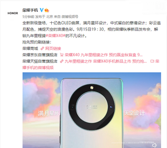 9月15日见 荣耀X40开启预约 当彩云追月遇上满月星环