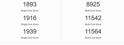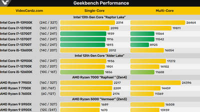 以下是外媒 VideoCardz 总结的 Geekbench 跑分对比: