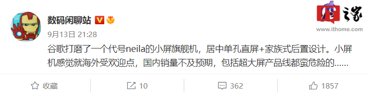 据数码博主 @数码闲聊站 昨日透露,谷歌正在打磨一款代号为“neila”的Pixel 小屏旗舰手机。外观方面,该机将采用居中单挖孔直屏 +家族式后置设计,这意味着 Pixel小屏旗舰手机整体外观将采用“防爆盾”式风格。该博主还表示,小屏手机在海外市场更受欢迎,在国内则销量达不到预期。除了小屏手机,超大屏产品线也较为危险。