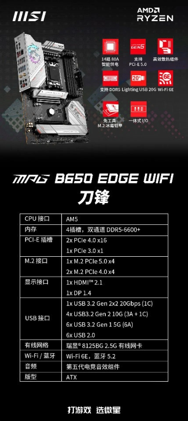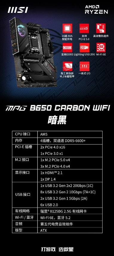 此外微星本次发布的三款 MPG 系列 B650 主板:ATX 板型的 MPG B650 CARBON WIFI 暗黑、MPG B650 EDGEWIFI 刀锋以及 ITX 板型的 MPG B650I EDGE WIFI 刀锋也将陆续上市。