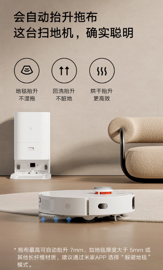 米家全能扫拖机器人 1S 可自动抬升拖布 7mm,防止拖湿地毯。对于厚度超过 5mm 或长纤维材质的地毯,用户可开启“躲避地毯”模式。