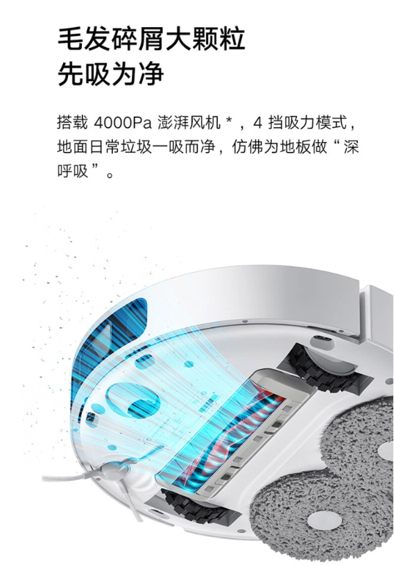 IT之家了解到,米家全能扫拖机器人 1S 搭载 4000Pa 风机,拥有 4 挡吸力模式。米家全能扫拖机器人 1S配有摄像头、人工智能图形算法,可智能识别房间类型,用户可为每个房间设置专属清洁方案。