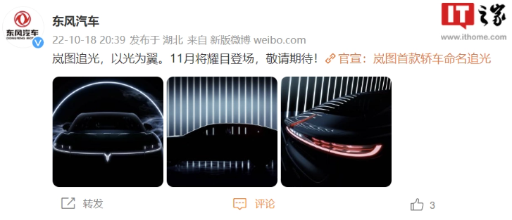 东风旗下岚图首款轿车定名“追光” 封闭式格栅 + 贯穿式 LED 尾灯