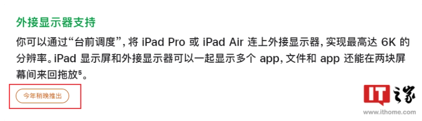 台前调度的外接显示器支持将无法在 10 月 25 日上线,官方称“今年稍晚推出”,支持分辨率最高可达 6K,便于用户以理想的方式组织工作空间,在iPad 和外接显示器上同时各自运行最多可达 4 个 App。